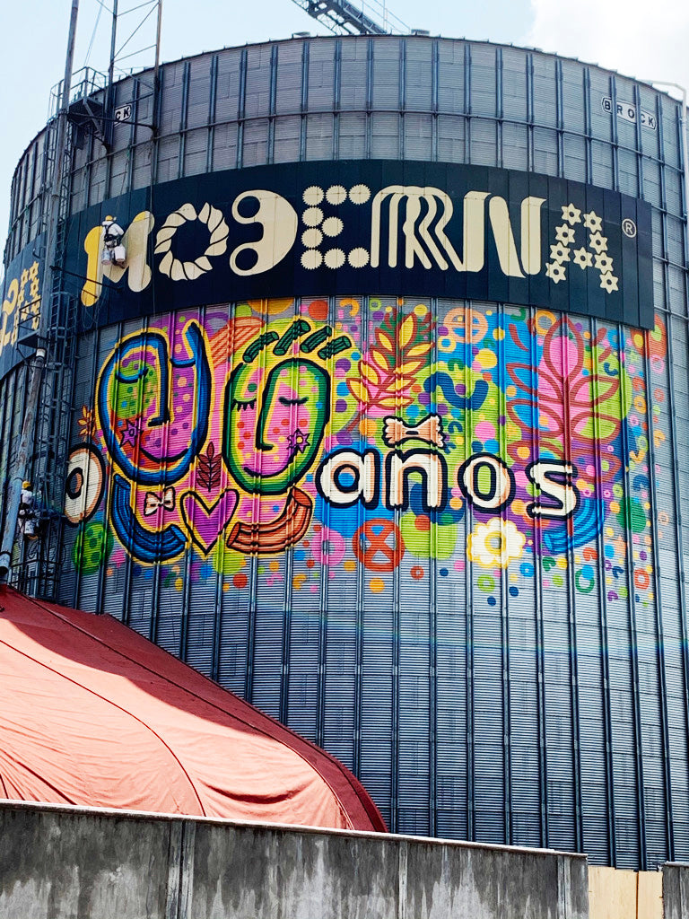 El proyecto más desafiante de mi carrera en el muralismo sin duda ha sido este. Desde pintar a 30 metros de altura hasta pintar un mural de 600 m2 el mural para la Marca “la Moderna” es definitivamente de mis favoritos.